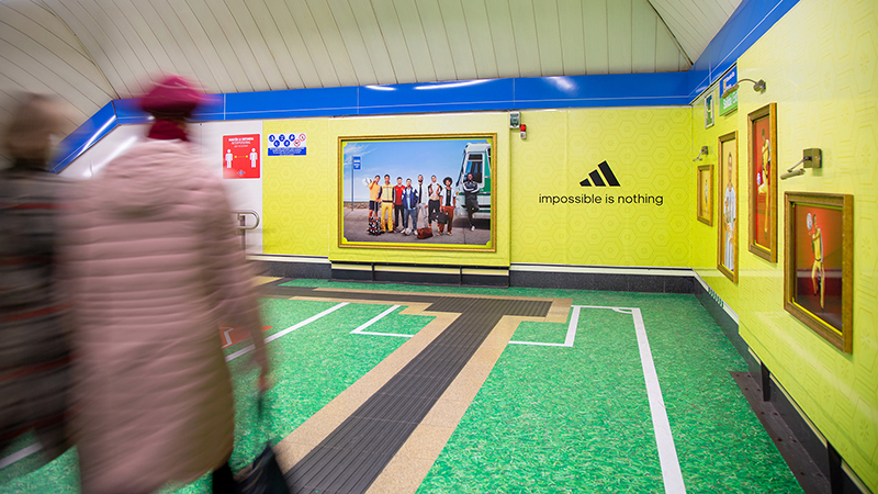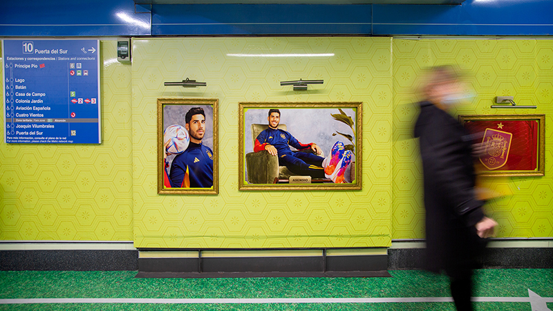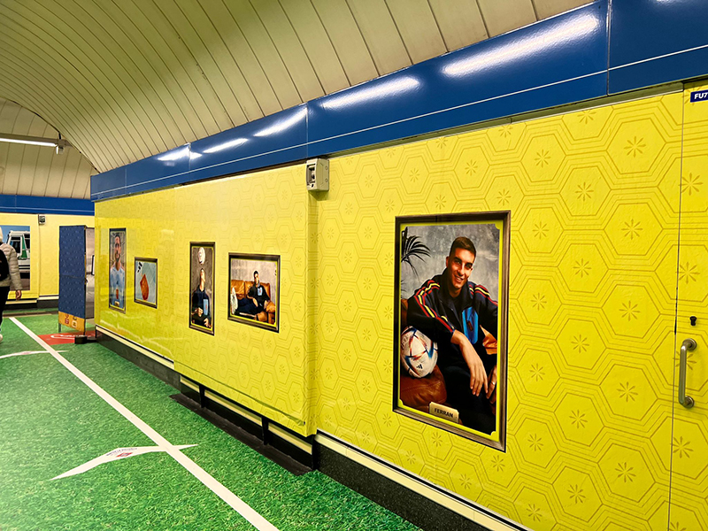 Adidas transforma el metro de Madrid con paredes amarillas y cuadros llamativos que protagonizan a una variedad de jugadores de fútbol famosos.