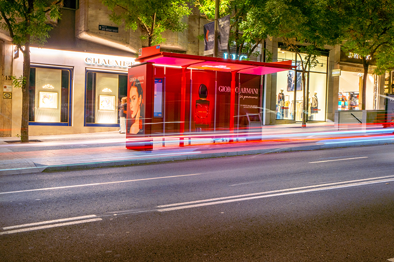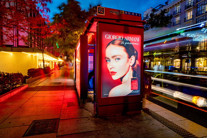 Giorgio Armani estrena nuestro Gran Formato Serrano con pantalla y metacrilato impreso retroiluminado y añade a su Dominación Milla de Oro iluminación dinámica en los techos de las marquesinas que “palpitan” al ritmo de su Sí Passione.
