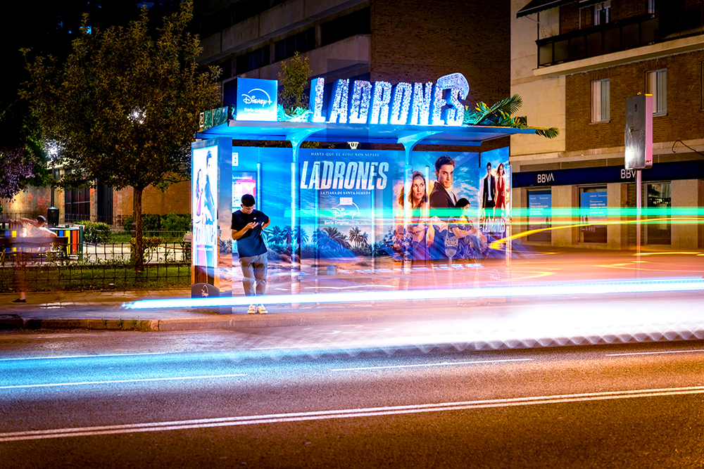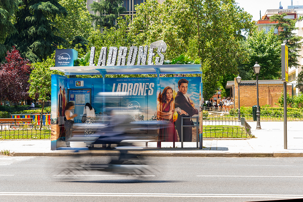 Marquesina totalmente vinilada de la nueva serie en Disney+, "Ladrones", con corpóreos en techo e iluminación.