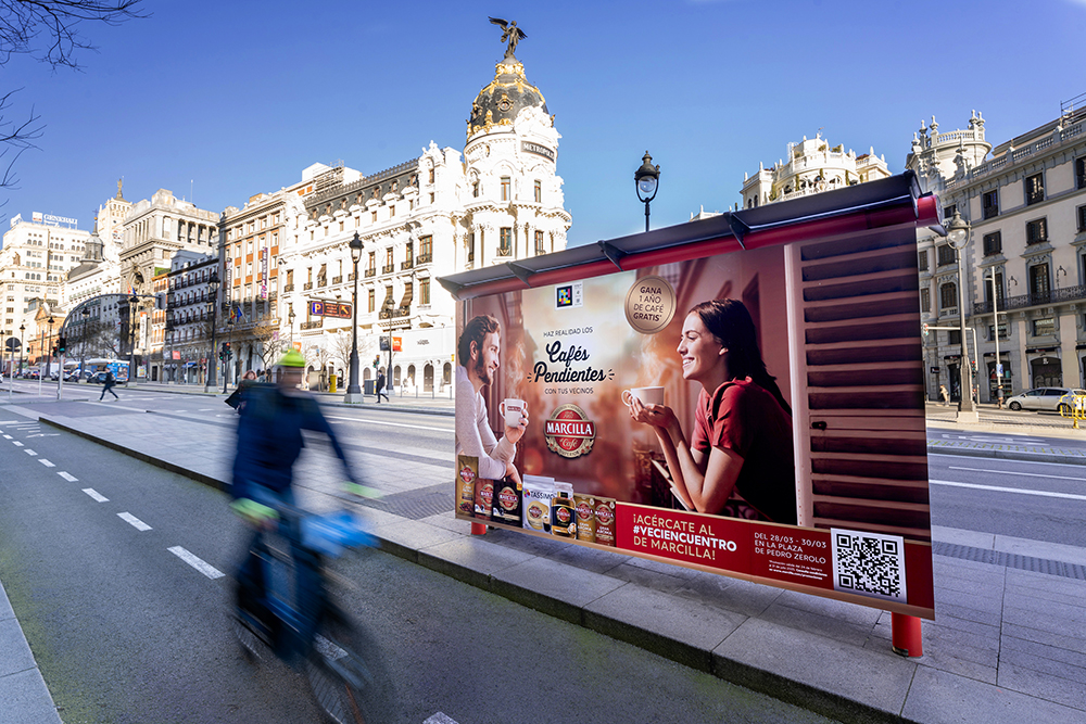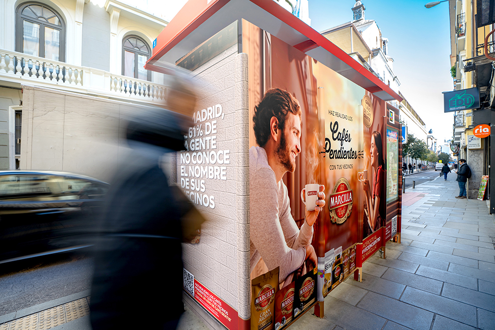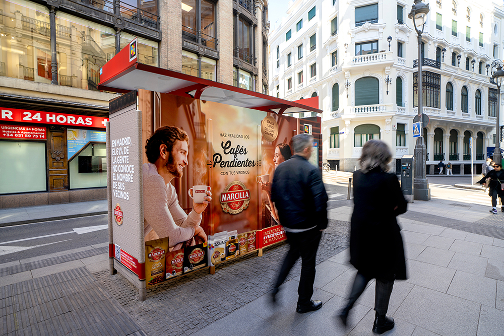 Marcilla lanza la campaña “Cafés Pendientes” en las marquesinas de Madrid para promocionar el Veciencuentro, un encuentro multitudinario en la PLaza Pedro Zerolo para disfrutar de un café.