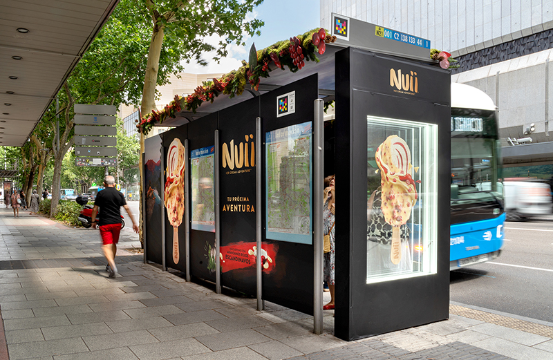 NUII presenta su nueva campaña utilizando vinilado integral de la marquesina y un mupi transparente para demostrar su nuevo producto