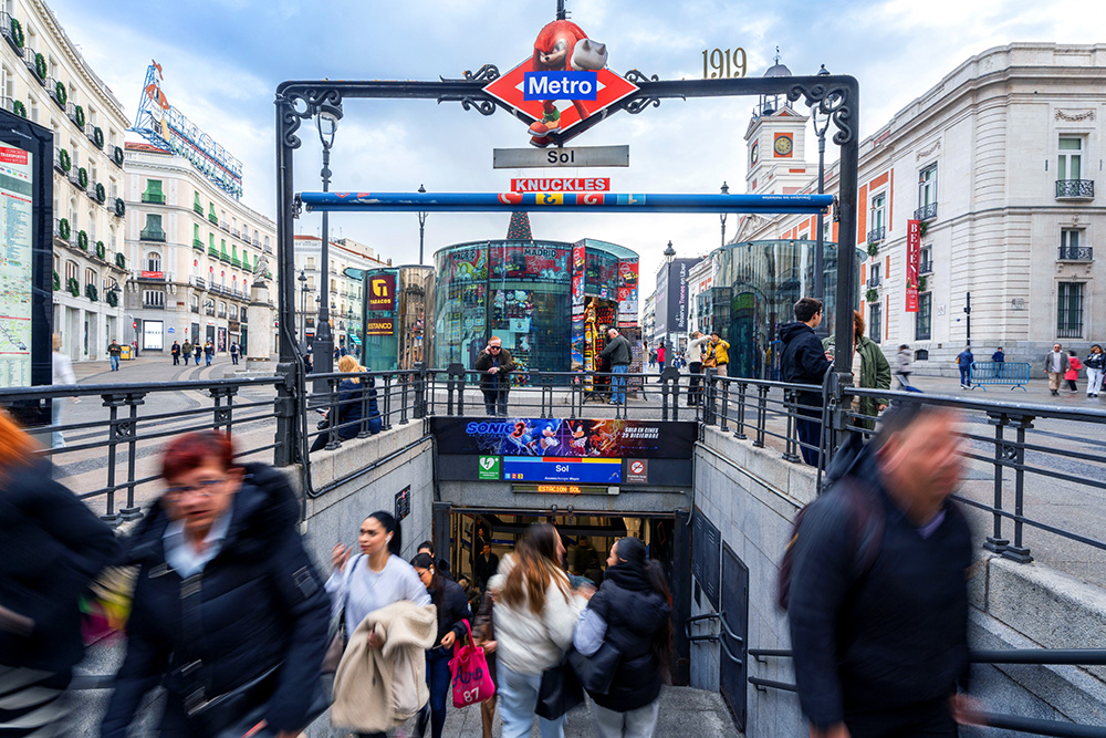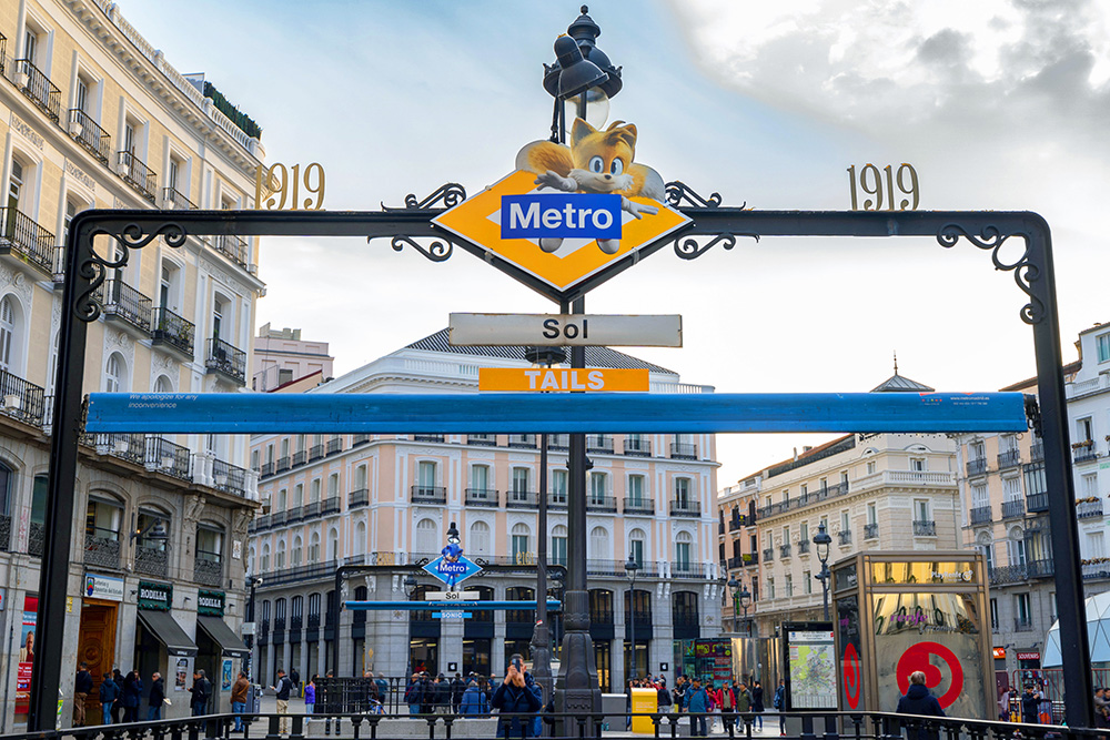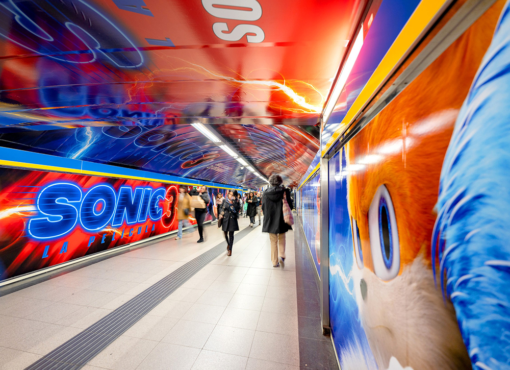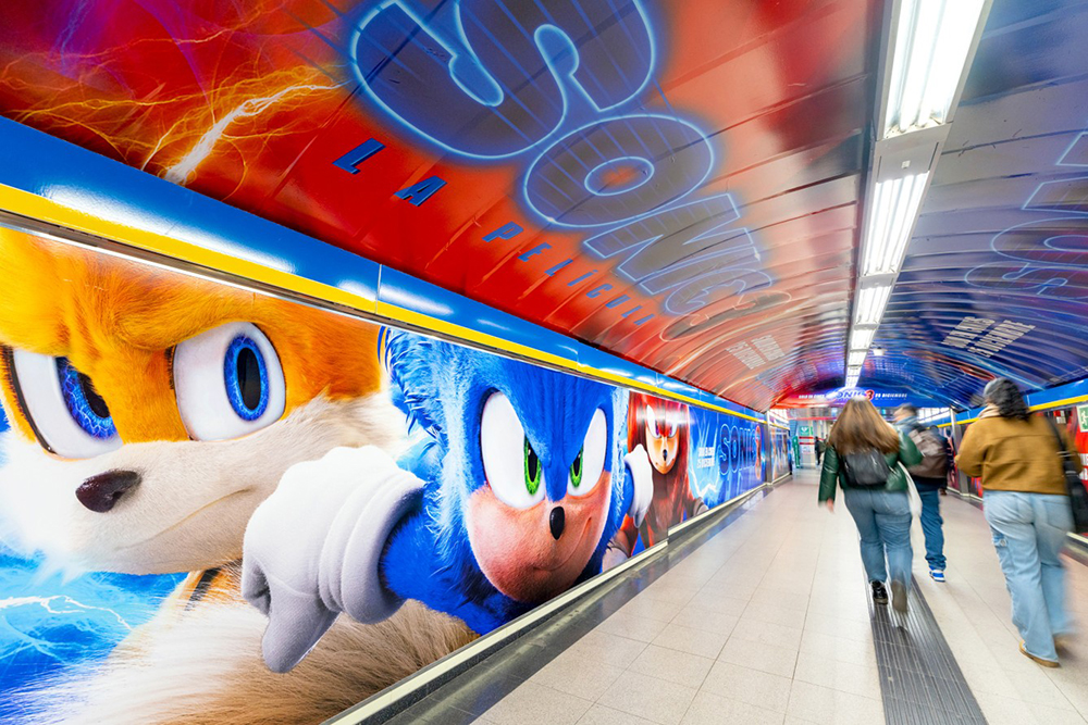 Campaña para promocionar la nueva película de SONIC 3 con vinilado completo del metro y actores con disfraces de los personajes icónicos de la película.